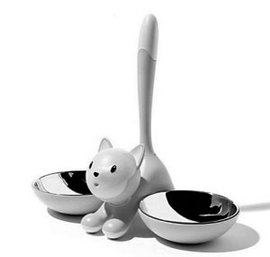 一只準備開跑的小貓身邊放著兩個盤子。從貓的表情到直豎的尾巴再到流線設計的食盆,做工都相當精致,只有家有愛寵的人才能如此貼心地專門為貓咪打造這樣一個食盆。
