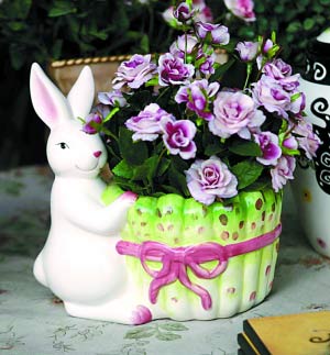 小白兔應(yīng)該是愛花族吧,和鮮花形成美妙的組合。兔子含笑地捧著花盆,仿佛在展示著花朵的美麗,也在展示自己的可愛。此款花瓶最適合可愛的女生,擺在書桌上或是化妝鏡前,一定會帶來意想不到的生動。