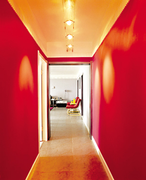 大膽地應(yīng)用了亮紅色,一進(jìn)門就可以感覺到濃濃的暖意,但設(shè)計(jì)師建議在走廊的兩邊懸掛主人的一些有回憶的照片,增加一下情調(diào)。
