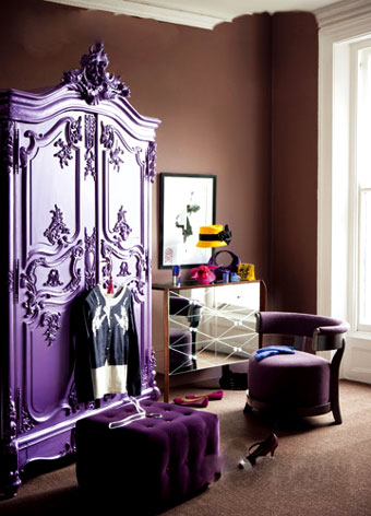 如果你是視覺(jué)沖擊力很強(qiáng)的色系的忠實(shí)擁護(hù)者,那么千萬(wàn)不要錯(cuò)過(guò)這個(gè)最?yuàn)Z目的房間造型。散發(fā)著珍珠光澤的紫色古典樣式衣柜,觸感舒適的絲絨沙發(fā)凳,搭配用鏡面裝飾的梳妝臺(tái),制造出位的華麗效果。