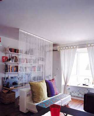 空間分割并不單純依靠墻壁,很多軟性的裝飾也能起到同樣的作用,在視覺(jué)和感覺(jué)上使空間既能獨(dú)立存在,又能與其他空間共通,避免擁擠的感覺(jué)。