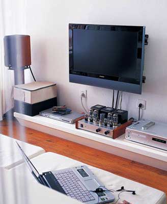 客廳與工作間在房屋的中央?yún)^(qū)域,這里最重要的一員是雙向滑動(dòng)沙發(fā)——并置的雙座,可以在沙發(fā)靠背中間獨(dú)立滑動(dòng):當(dāng)雙座同時(shí)置于電視墻一側(cè),可形成視聽(tīng)娛樂(lè)狀態(tài);同時(shí)置于工作間一側(cè),則可與書(shū)架底層的讀寫(xiě)桌面構(gòu)成工作空間;當(dāng)沙發(fā)雙座各置一端,又可成為混合狀態(tài)。懸掛在沙發(fā)靠背正上方的流蘇簾將兩個(gè)區(qū)域有效分隔,使它們彼此相連,又相對(duì)自成一體。