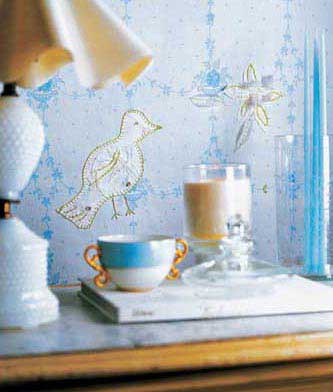 有沒有想過印花壁紙上出現(xiàn)刺繡圖案會是怎樣的一種效果呢?把手工刺繡的花鳥圖案粘貼在壁紙上,會使空間看上去更加柔和,并富有意境。