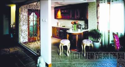 由于廚房門前的空間較小,如果使用墻體或其他厚重材質(zhì)將其與門廳分隔,難免會使此空間顯得太壓抑,因此使用了金色鏤空鐵藝作為隔斷。和屋內(nèi)實(shí)木整體厚重的感覺相比,鐵藝產(chǎn)品借鑒歐洲古羅馬時(shí)期純樸、質(zhì)感的加工工藝,與現(xiàn)代精湛的鍛造手段相結(jié)合,制造出具有歐洲古典風(fēng)格且蘊(yùn)涵現(xiàn)代氣息的隔斷,既有效地區(qū)分了功能區(qū),又充滿輕盈通透的美感,而且鐵藝的質(zhì)感、線條、造型與居室整體的歐式風(fēng)格也非常協(xié)調(diào),并且使廚房門前的狹小空間也得到了充分利用,成為一個(gè)西式餐區(qū)。