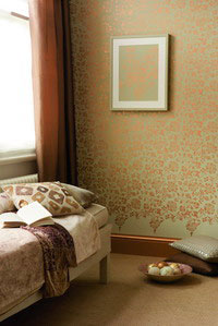 選擇優(yōu)質(zhì)的水性金屬質(zhì)感的涂料 ,在已經(jīng)上了基礎色的啞光墻面上用模板重復涂裝,做出壁紙一樣的效果,再配上印花天鵝絨、光亮的綢緞和刺繡品作為點綴。無論房間的整體氛圍是典雅還是現(xiàn)代,這種風格都很合適。