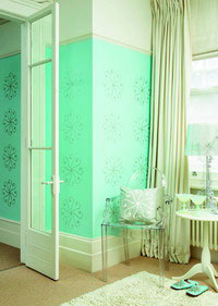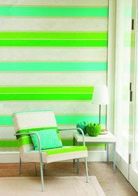 以一種由青綠色和淡黃綠色條紋組成的家居織物作為創(chuàng)意的來源,在墻上涂抹出相同的圖案,這種現(xiàn)代風格的嘗試,像是一匹放大的椅子包面,產(chǎn)生出奇妙的視覺幻象,適用于裝飾起居室,同時也適用于臥室。