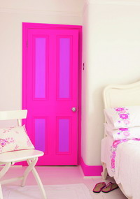 一反過去彩色墻壁搭配白色木制家具的風格,我們可以把門和木制品用絢麗奪目的色彩裝扮,再配上純白色的墻壁,新意別出。選用亮粉色涂刷門、門框和踢腳板,用淡紫色涂抹內(nèi)門嵌板來搭配,這是使用鮮亮色彩涂刷房間的一種巧妙創(chuàng)意,不必刷一整面特色墻壁,卻能達到同樣亮眼的視覺效果。
