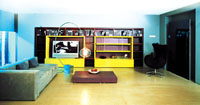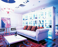 將燈光與周邊環(huán)境和諧搭配是配飾設(shè)計師要考慮的重點問題。在這個有著60年代新懷舊風(fēng)格的書房中,高挑的落地書柜,仿佛一堵透明的墻,將水晶吊燈投注的光束折射過來,整個書房被映照的格外明亮。隱匿于書柜中的低能燈泡散發(fā)出柔和的光輝,使書房顯得更加舒適與溫馨。當(dāng)臥室一角的光線透過書柜傾瀉進來,書房的一切都隨之通透起來。奢華的水晶燈在玻璃書柜的映襯下光芒四溢。