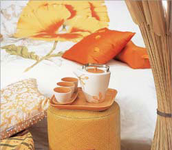 草燈、墩椅、懶骨頭靠枕的顏色都是黃色,但是深淺不同,給人一種節(jié)奏感。