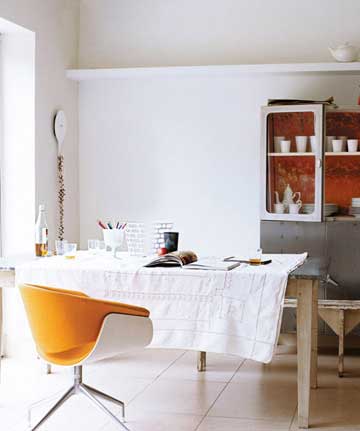 一把極具風(fēng)格的橙色椅子和橙色材質(zhì)的櫥柜使實(shí)用的廚房凸顯性格。精致的亞麻提花的舊桌布既遮蓋了有些磨損的桌面又給廚房帶來些許溫和雅致的氣質(zhì)?,F(xiàn)在廚房在不做飯時(shí),也可以被用來看書或者思考了。