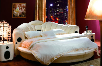 躺靠在床上,聽聽音樂是很美的享受。在床的對面兩邊,安裝立體聲音響,猶如請來一個“交響樂團”,使你在入睡前首先進入一個音樂的殿堂,古詩曰“床前明月光”,后讀為“耳邊有交響,舉頭望明月,臥室是天堂”。床,成了你音樂殿堂中的一個“包廂”。