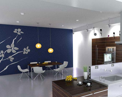 以暖色為基調(diào),墻面是淡桔色,地面為暖色的地毯,桌面可飾紅色的布藝,飾品柜中可擺插花、燭臺(tái)、餐具、酒杯等各顯其色。窗簾和室內(nèi)其他布飾多采用大花織物。窗臺(tái)上可點(diǎn)綴些綠植。五彩的燈光與墻面抽象的裝飾畫(huà)呼應(yīng)。
