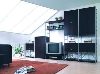鋼木組合架線條明快、風(fēng)格簡(jiǎn)約,多功能組合架成了電視背景墻,這種做法非常適合小戶型。但組合架最好有開有合,關(guān)閉的柜門或抽屜可以放置書籍、CD、雜物等零亂的東西,樣式美觀的書籍或裝飾品放在外面展示,這樣才不會(huì)讓視覺過于擁擠。