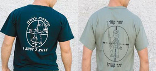 欠妥T恤衫圖案描繪了以色列與巴勒斯坦的武裝沖突,其中不乏有辱巴勒斯坦人的內(nèi)容。系列T恤中的一款印畫著一名在瞄準(zhǔn)器內(nèi)的巴勒斯坦小男孩,圖配標(biāo)語“越是個兒小,越難對付”。