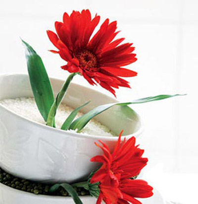 在漂亮的湯碗中盛放一點(diǎn)大米、豆子,也可以創(chuàng)意出小小的盆景。記住米至少盛放容器的三分之一,以避免花朵搖晃不穩(wěn)。帶有小家碧玉氣質(zhì)的白色雛菊,可以充分表現(xiàn)清新的美感和氣氛。細(xì)致可愛的花型,宛如粉蝶般,給剛性鍋具平添了幾份溫柔和優(yōu)雅。