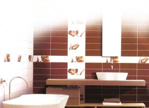 馬桶上方的墻面沒有很多空間可以自由發(fā)揮,而且還要和馬桶搭配和諧。六片花磚組成的一組圖案,在設(shè)計中加入一些卡通的概念在里面,是使空間變得活潑的一種方法,而且在運用時宜精不宜多。