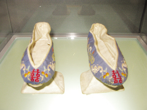 此次還展出了兩雙旗鞋,稱“高底鞋”,由于形似花盆,也有稱為“盆底鞋”,還有的像馬蹄,稱“馬蹄底鞋”。記者發(fā)現“高底鞋”都較大,但木跟高達10厘米。袁榮解釋說:“滿族婦女不纏足,他們自古有‘削履’的習俗,冰雪天穿草鞋防滑。其余時間則穿木底鞋,以便在疏松的土地上活動。鞋跟是用白細布裱蒙,鞋面用刺繡、穿珠制作??赡苁撬麄兇┍缎木壒?,所以穿這么高的鞋也習慣了。”慈禧太后穿的高底鞋比較特別,把鞋頭做成一個鳳頭形,嘴銜珠穗,因此稱為“鳳頭鞋”。
