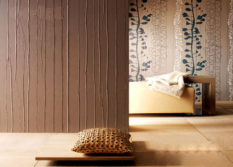 主體特征:這類(lèi)壁紙不論采取什么工藝或材質(zhì),目的都很明確:讓墻紙無(wú)論在視覺(jué)上還是觸覺(jué)上都更加立體。最簡(jiǎn)單的方法是采用PVC加發(fā)泡劑或其它成分貼于紙底上,制造出要追求的各種紋理;較為復(fù)雜的方法是采用介于壁紙和涂料之間的新型墻面裝飾材料——墻基布,以特有的豐富肌理,配合墻漆,展示出獨(dú)特的三維立體效果,從而脫離了傳統(tǒng)墻面簡(jiǎn)單的色彩搭配,更為喜愛(ài)自己動(dòng)手的人增添了許多DIY的樂(lè)趣。