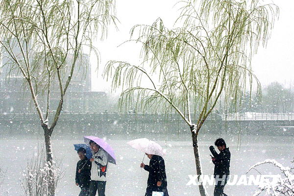 3月24日,山東濱州學院的幾名學生冒雪行走在校園里。