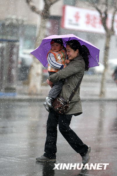 3月24日,一對母子冒雪行走在煙臺街頭。新華社發(fā)