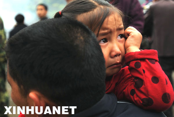 3月27日,在青川縣關(guān)莊鎮(zhèn)寺壩板房區(qū),4歲的小芳與親屬淚別。