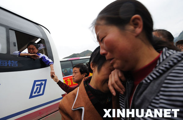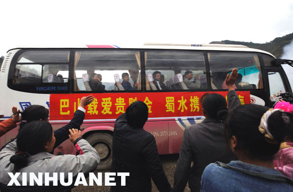 3月27日,青川縣關(guān)莊鎮(zhèn)寺壩板房區(qū),鄉(xiāng)親們向離別故土的人們揮手道別。