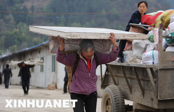 3月26日,青川縣關(guān)莊鎮(zhèn)寺壩板房區(qū),村民正在搬自家物品。