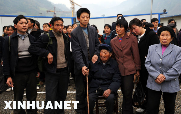3月27日,在青川縣關(guān)莊鎮(zhèn)寺壩板房區(qū),離鄉(xiāng)的人們依依不舍