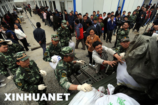 3月26日,青川縣關(guān)莊鎮(zhèn)寺壩板房區(qū),武警戰(zhàn)士幫助楊建紅夫妻倆把家具搬到軍車上。