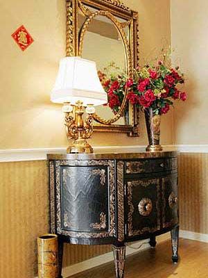 照明方面,由于玄關(guān)里有許多彎曲的拐角、小角落與縫隙,所以讓照明設(shè)計分外困難。使用嵌壁型朝天燈與巢型壁燈都可讓燈光上揚,產(chǎn)生相當(dāng)?shù)膶哟胃?,而且也有從玄關(guān)持續(xù)延伸至樓梯上的感覺。此外,你也可以利用一對吊燈,或是如果有足夠的空間擺上一張小桌子,也可以用一兩盞燈補強光線。另一個能將幽暗的玄關(guān)裝點得比較活潑有趣的方法是,設(shè)法在回廊上掛幾張照片、圖片或畫作,更可以在畫上加兩盞小燈,讓你所珍愛的收藏分外耀眼,引人注目。