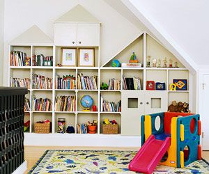 收納架不是正方形或長(zhǎng)方形,換個(gè)角度我們就可以創(chuàng)造出一些新奇的收納方式。在斜屋頂下正好適合這些三角形開(kāi)放式收納架,在兩個(gè)有門(mén)的收納柜中可以放一些不讓孩子觸及的物品。