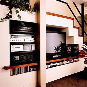 要想讓你的視聽(tīng)區(qū)域看上去很大,那就要把電視機(jī)塞到樓梯下面的空間去。這樣的話(huà),就可以不占用居室內(nèi)的空間,為你騰出更多坐立區(qū)域。記得在樓梯下所設(shè)計(jì)的收納柜,除了電視機(jī),還要能塞進(jìn)立體音響、DVD播放器、CD播放器等。
