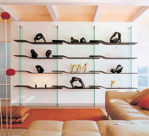 客廳擱架主要突出其展示功能,而擱架的本身設(shè)計(jì)要么前衛(wèi)時(shí)尚,要么和整體家居風(fēng)格一致,而擱架最好為開放式,可以放置一些具有觀賞效果的小件物品,對整個(gè)客廳的裝飾起到提點(diǎn)作用。