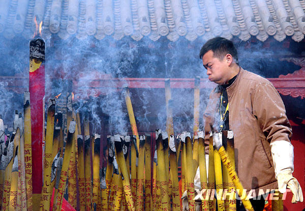 3月29日,在河南省新鄭市黃帝故里景區(qū)正殿前,香客們圍著燭臺(tái)點(diǎn)香。當(dāng)日是農(nóng)歷三月初三,相傳是中華民族人文始祖黃帝出生的日子,人們紛紛到黃帝故里進(jìn)香祈福。