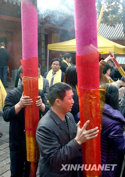3月29日,在河南省新鄭市黃帝故里景區(qū)正殿前,兩位香客抱著碗口粗的巨香,排隊(duì)進(jìn)香。當(dāng)日是農(nóng)歷三月初三,相傳是中華民族人文始祖黃帝出生的日子,人們紛紛到黃帝故里進(jìn)香祈福。