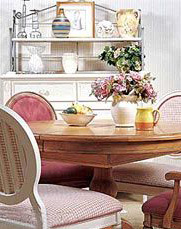 由于不少家庭出于戶型的考慮,并未特地開辟家居餐廳,但卻可以稍費(fèi)心思在客廳的某個(gè)位置標(biāo)新立異,于是一個(gè)特殊的就餐環(huán)境便能在客廳的范圍內(nèi)“渾然天成”。白色櫥柜因?yàn)殍F藝擱架的設(shè)計(jì)變得有些與眾不同,上面可以擺放些物品,集收納、展示于一體。而原木色餐桌與方格布藝餐椅椅墊相互搭配,形成悠閑清爽的地中海風(fēng)格。就餐的心情便像地中海的微風(fēng)迎面吹來般享受愜意。