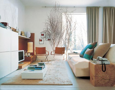 鋪一塊米色天然材質(zhì)的地毯,提升起居室的舒適度;沙發(fā)旁的小桌選用一塊方形原木充當(dāng),為環(huán)境增加親和力;擺上非常適合夏天使用的造型纖細的米色坐椅;掛上灰色窗簾,換一套很容易通過DIY 獲得的藍灰相間的布藝靠墊;擱板上擺一些白色裝飾品,墻面的裝飾畫要以純凈的顏色為主。
