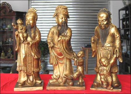 ?。?)福祿壽三星:“福星”手抱小兒,象征有子萬事足的福氣?!暗撔恰鄙泶┤A貴朝服,手抱玉如意,象征加官進爵,增財添祿。“壽星”手捧壽桃,面露幸福祥和的笑容,象征安康長壽。福祿壽三星中,本來只有“祿星”才是財神;但因為三星通常是三位一體,故此福、壽二星也因而被人一起視為財神供奉了。倘若把福、祿、壽三星擺放在財位內(nèi),有這三星拱照,滿堂吉慶,撇開風水不談,單是視覺上及心理上也會覺得十分舒服的。擔任文職的,以及受雇打工的人均宜擺放或供奉文財神;至于那些經(jīng)商做老板,以及當兵當差從事武職的人,則應該擺放或供奉武財神。