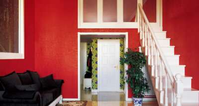 大廳的墻是紅色,很扎眼,但家具是白色的,窗簾是黑色的,這幾種顏色搭配起來特別鮮明。樓道吉米選擇綠配紫,屬于對(duì)撞的顏色里最沖突的,吉米說只有這樣才會(huì)把主題包括主人的個(gè)性充分表達(dá)出來,非暖即冷,反正不會(huì)選擇中庸。