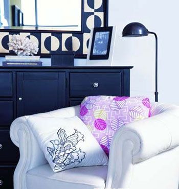 真絲絲巾靠墊的圓案與周圍家居裝飾呼應(yīng),親切溫婉的粉紅色溫暖了色調(diào)冷靜的空間。