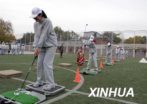 資料圖片:2008年10月29日,北京第二中學(xué)的學(xué)生在上高爾夫球課。當(dāng)日,北京市普通高中新課程體育與健康教學(xué)展示活動(dòng)在北京第二中學(xué)舉行,高爾夫、瑜珈、跆拳道等選修體育新課程亮相。新華社發(fā)