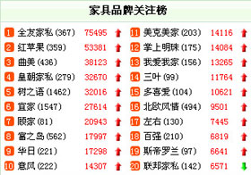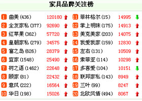 圖二是截至4月8日的家具品牌關(guān)注榜及關(guān)注度top10分布圖,跟圖一相比我們不難看出,品牌關(guān)注榜的普遍關(guān)注度均走上升趨勢,排行第一由原來7萬增長到了十二萬,北方家具曲美超越了四川的全友榮登第一寶座,而緊跟其后的依然是全友、紅蘋果、皇朝等知名品牌家具企業(yè)。值得一提的是富之島家具由上月的排名第八竄升到本月前五名,關(guān)注度也大幅上漲。