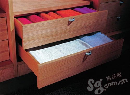 由不同規(guī)格的木板與連接五金件拼裝而成,比木榫連接更牢固。旋轉(zhuǎn)衣架、下拉式掛桿、各種功能性拉籃在此大顯身手,所有服飾都能在其中找到自己合適的“家”。