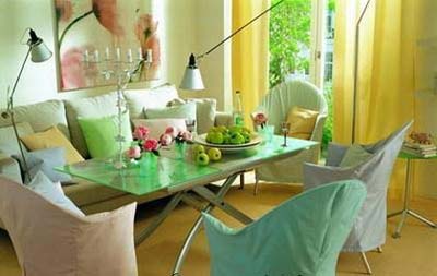 在整體空間面積不大的房子中,可以不專(zhuān)門(mén)開(kāi)辟就餐區(qū),將玻璃餐桌往“玻璃墻”邊一靠,通過(guò)鏡子的效果,讓整個(gè)空間得到了充分的利用和延展,同時(shí)有效地讓視覺(jué)空間得以放大。