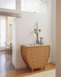 玄關(guān)面積不大,許多人會在這里擺放一個方正的大柜子,如果在柜子的造型上稍作改變,如將方正的柜子改成斜三角形、倒梯形……存儲的東西不少,卻顯得更輕巧。