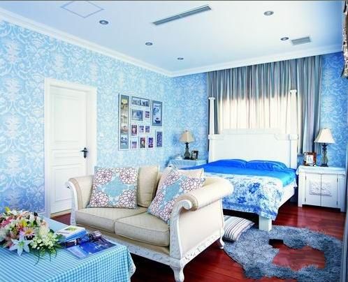 點睛:藍色的淺淡清雅,最適合作為背景色大面積使用,壁紙、墻面涂料、軟裝是藍色的活躍舞臺。要想烘托出藍色的嫵媚多變,用白色的家具和配飾進行調(diào)和最為妥當。