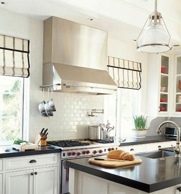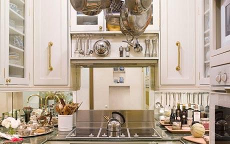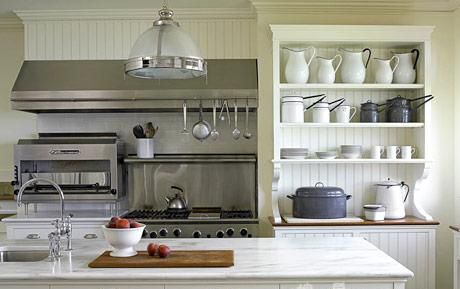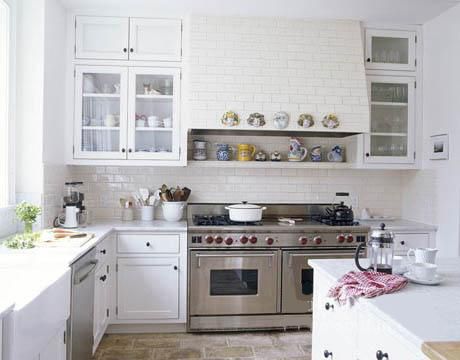 這款廚房它具有一張非常純凈的外表。櫥柜臺面采用精細打磨的卡拉拉大理石制成。灶具具有六檔火力調(diào)節(jié)。最出彩的在于對抽油煙機的設計,通過白色瓷磚砌成的墻面精細的包裹住油煙機,并在墻面上開鑿了擺放調(diào)料等的儲物架既美觀又實用。
