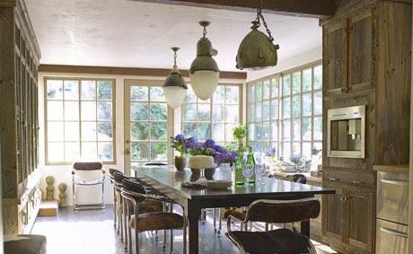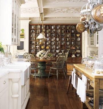 在這個空間里融匯了古代與現(xiàn)代的雙重元素?,F(xiàn)代簡潔的白色櫥柜與古董橡木櫥柜相應成趣。古銅餐桌與寫滿滄桑的鐵藝座椅述說著歷史的韻味。一面古董陳列架更是為整個廚房空間增添了時光輪回的感覺。