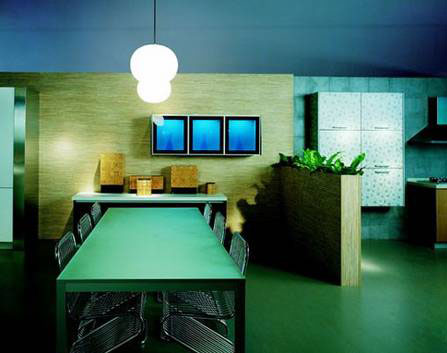輕松舒爽、賞心悅目的色彩。綠色是永遠(yuǎn)用不完,永遠(yuǎn)不會(huì)讓人感到厭煩的主題,因?yàn)樗拿恳稽c(diǎn)變化,都對(duì)應(yīng)著自然給人類的印象,所以綠色適合所有喜歡它的人。從淡綠轉(zhuǎn)化為灰綠,然后暗紫,完成室外到室內(nèi)的過(guò)渡,對(duì)應(yīng)了人的視覺(jué)對(duì)空間的自然反應(yīng)。淡綠如田野的地板,黃色如秋葉的柜體,墨綠如松針的臺(tái)面,構(gòu)成一幅自然景色,使人心情豁然開(kāi)朗。淡綠與淡藍(lán)的配合,則使廚房充滿盎然生機(jī)。生活在淡綠的空間里,夢(mèng)都是清新的。明快而錯(cuò)落的綠,讓人仿佛來(lái)到青山翠谷。