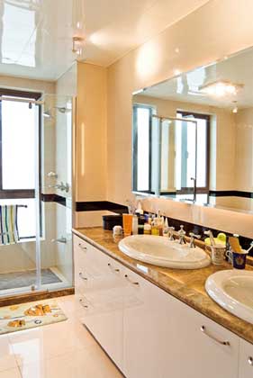 這套房型有兩個(gè)衛(wèi)浴,和其他人家不同的是,主人講主衛(wèi)完全改成了洗澡間,整個(gè)空間,除了玻璃淋浴房之外,還有一個(gè)大面積的浴缸。梳妝臺(tái)部分,則代以非常大的雙人臺(tái)盆,長(zhǎng)面積的玻璃更加深了這個(gè)主衛(wèi)的空間感。對(duì)于享受品質(zhì)和私密的現(xiàn)代城市人來(lái)說(shuō),單獨(dú)功用的衛(wèi)浴也是一個(gè)極好的未來(lái)趨勢(shì)。